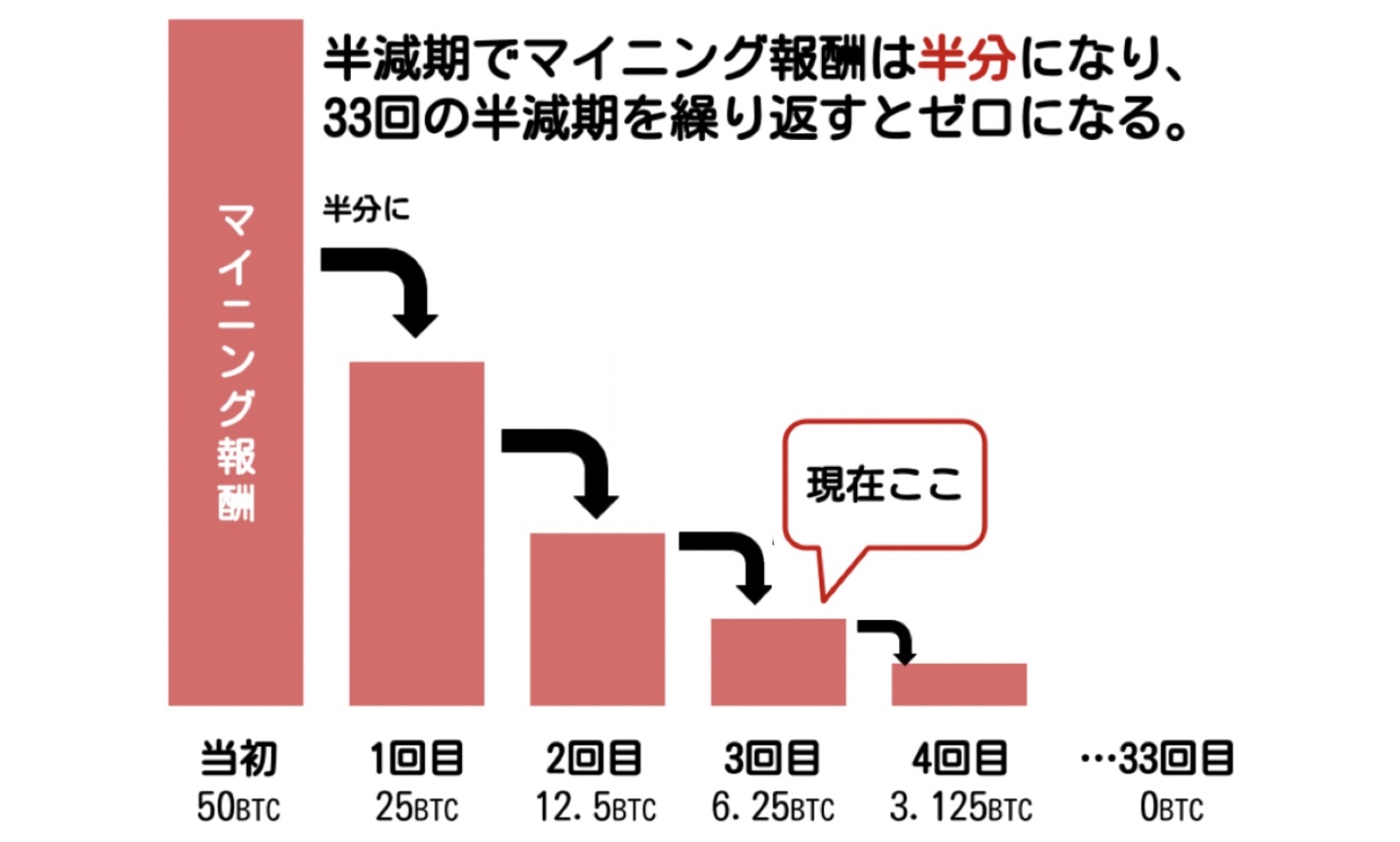 半減期とは、マイニングによって得られる新規発行のビットコインの量が半分に減少するタイミングを指します。