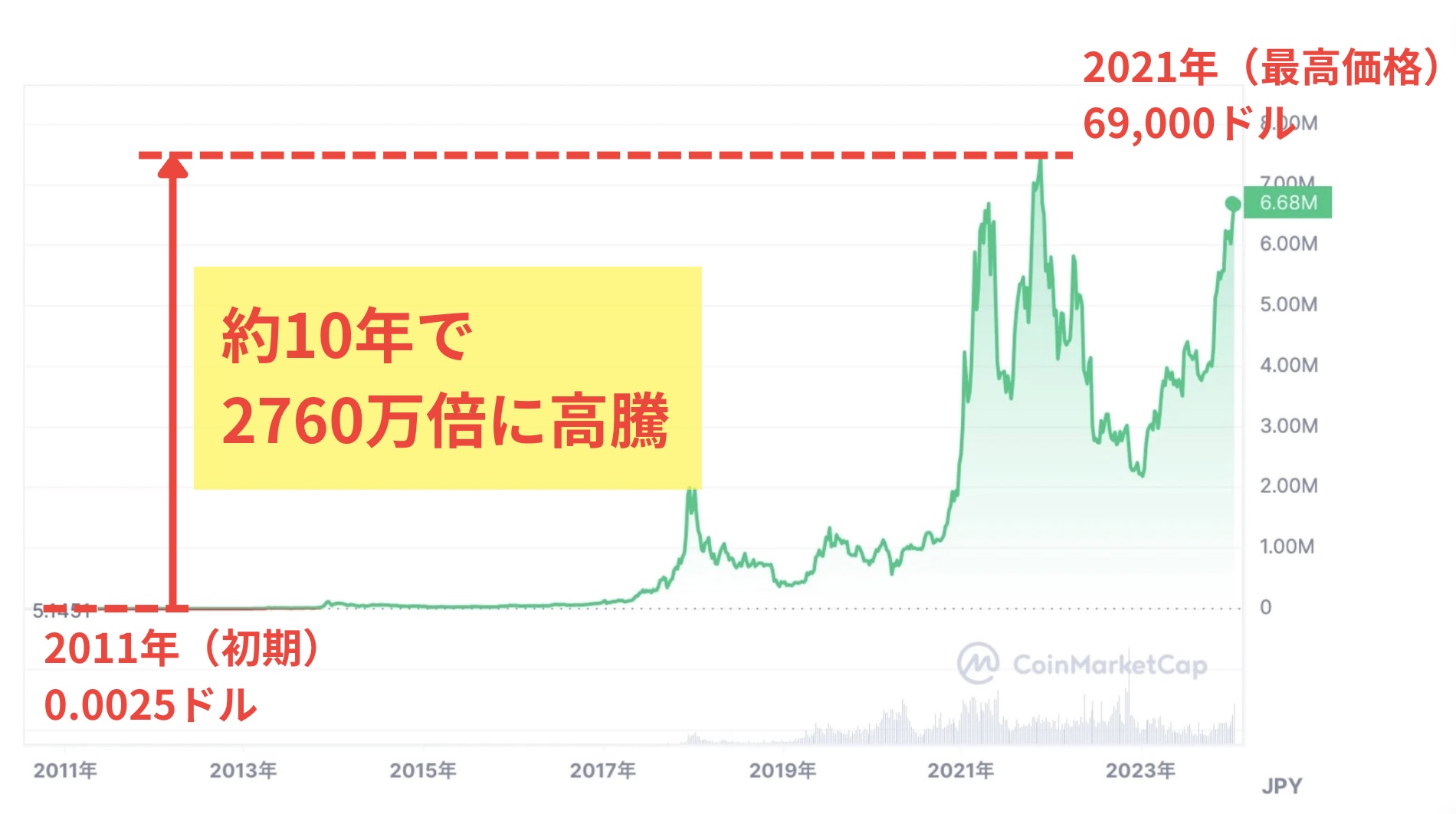 2011年に初めて1BTC=0.0025ドルで取引され、約10年後の2021年に最高価格1BTC=69,000ドルまで高騰しました。