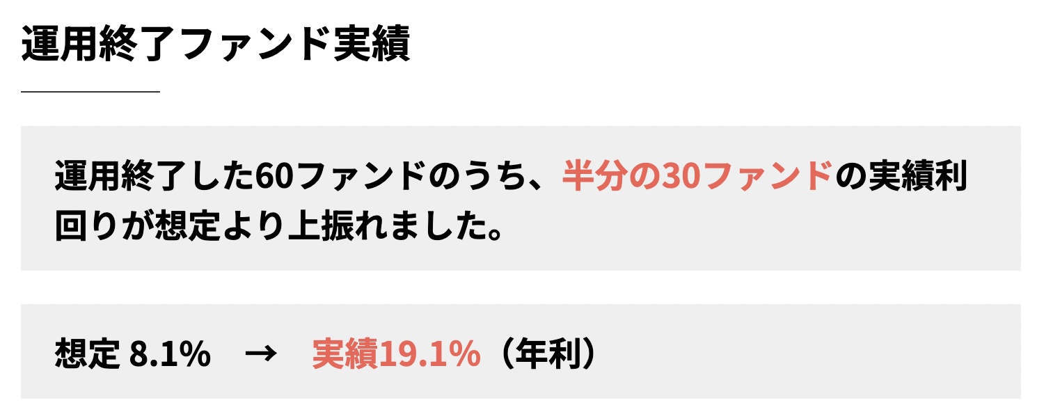 利回り(年利) | 実績19.1%(運用終了30ファンドの平均) |